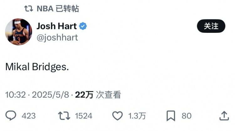 本场比赛,尼克斯球员布里奇斯在比赛最后阶段抢断塔图姆,继G1之后再次通过防守绝杀凯尔特人。赛后,尼克斯的另一名球员哈特发推,他在这条动态中就写了一个名字:“米卡尔-布里奇斯。”