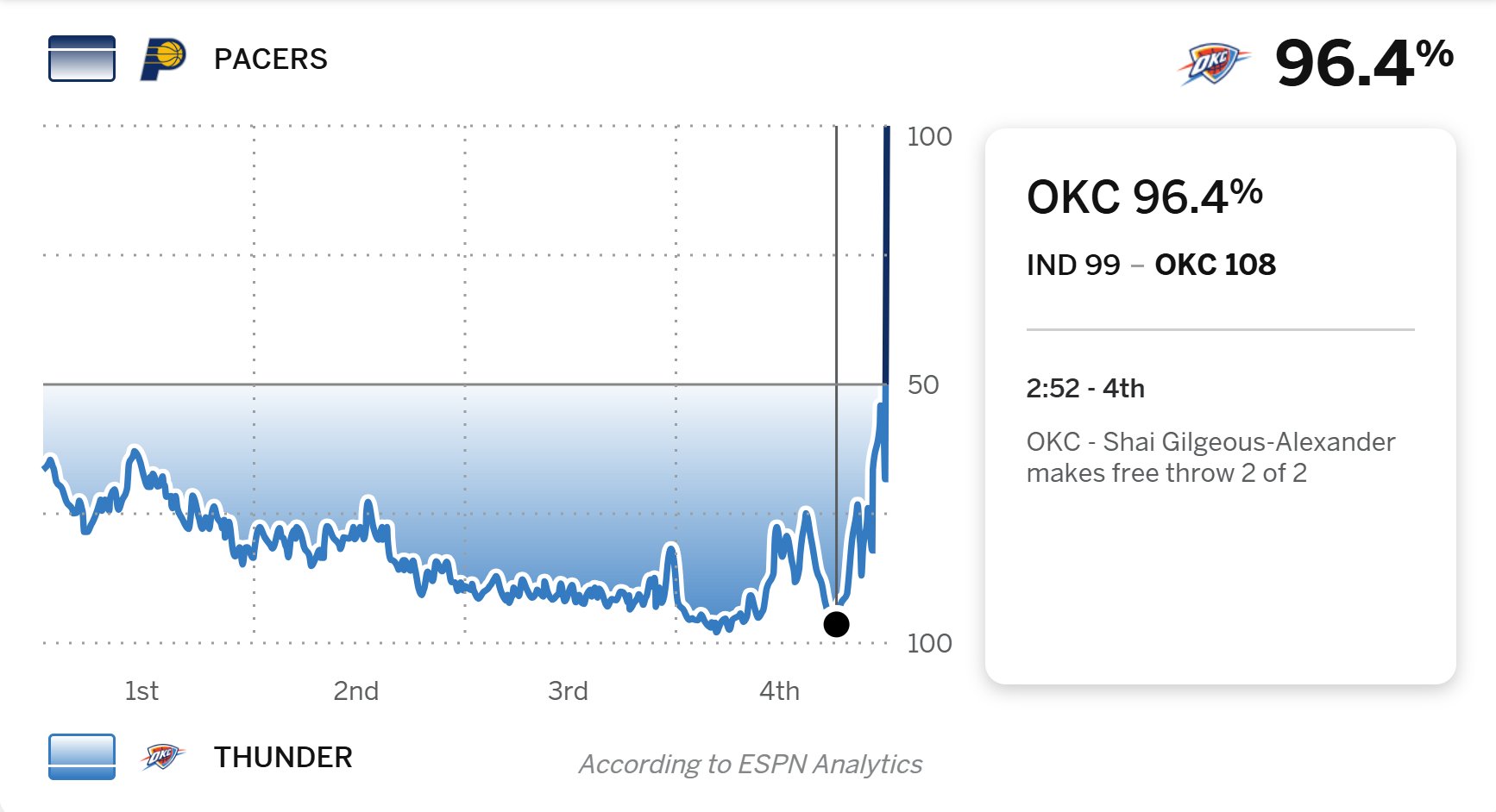 雷霆最后3分钟领先9分,胜率96.4%(最终输球)。”