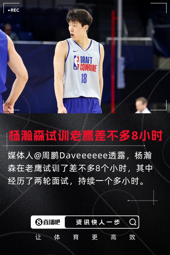 06月15日讯 今日,媒体人@周鹏Daveeeeee更新了杨瀚森的NBA球队单独试训情况。