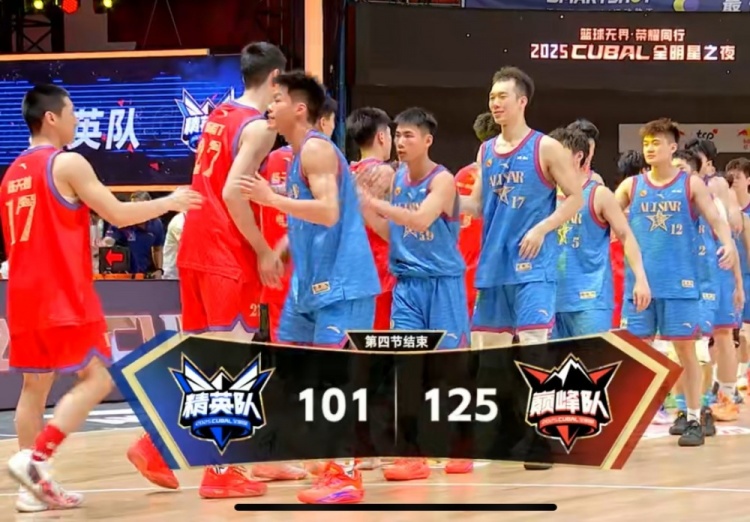 末节决战,胡汇上来追进打板三分,阿克力迅速回应answer ball,龚思成背后甩传助段世镭反击暴扣,祖力布哈尔助飞阿克力空接暴扣还能回应,巅峰队保持住十几分领先。管子煜四分球也能干拔命中,赵刘其政连续突破暴扣展示自己,卢骏转换三分再进,精英队无力回天,管子煜四分球还能命中,最后时刻双方展示扣篮秀,最终巅峰队125-101力克精英队。