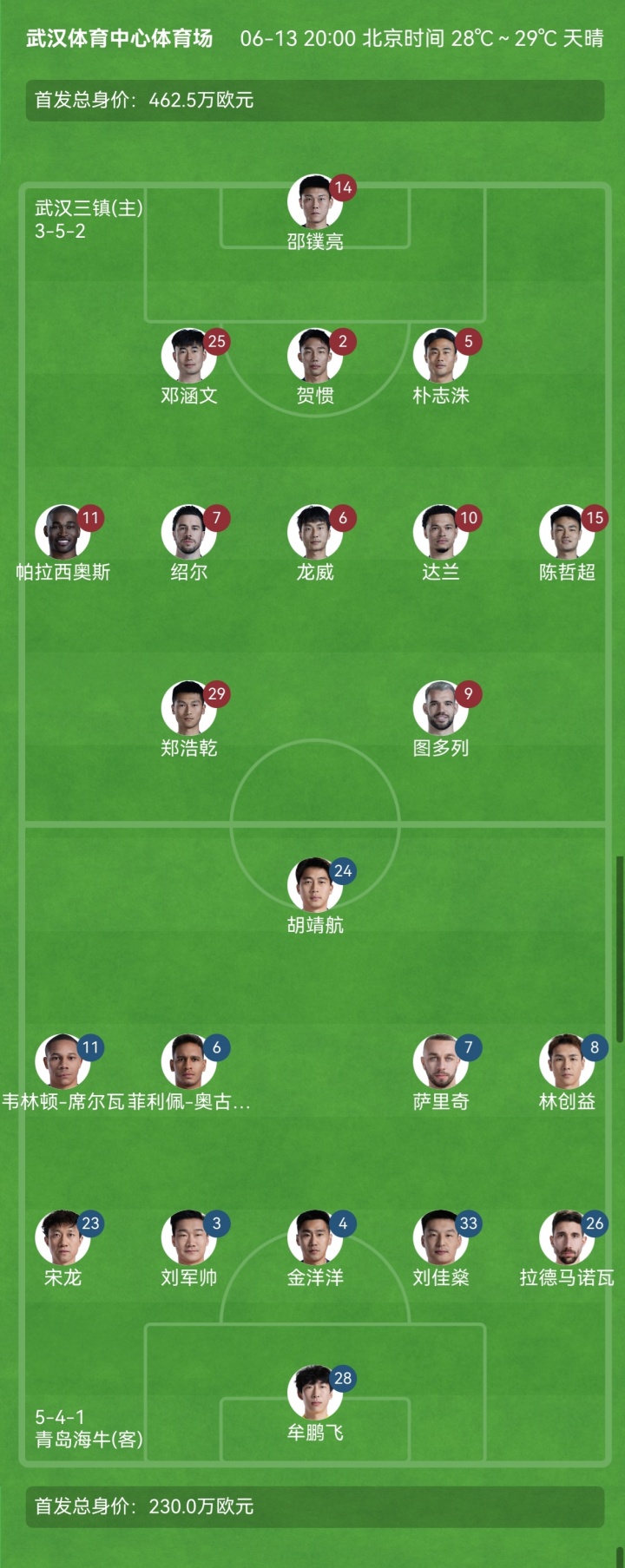 06月13日讯 北京时间20点,中超第14轮,武汉三镇主场迎战青岛海牛。赛前,双方首发出炉。