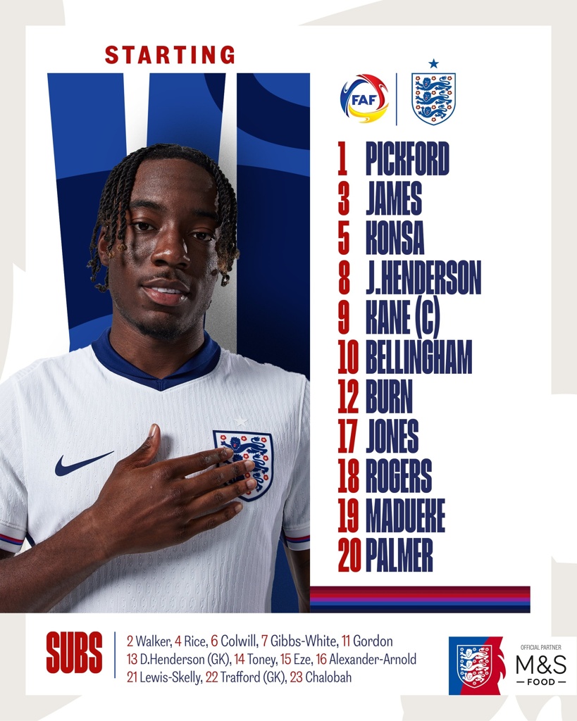 英格兰替补:13-迪恩-亨德森、22-特拉福德、2-沃克、4-赖斯、6-科尔维尔、7-吉布斯-怀特、11-安东尼-戈登、14-伊万-托尼、15-埃泽、16-阿诺德、21-斯凯利、23-查洛巴