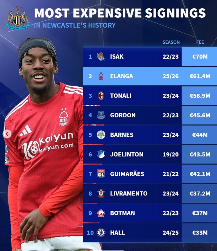 德转列纽卡队史引援榜:伊萨克7000万,伊兰加、托纳利、戈登在列