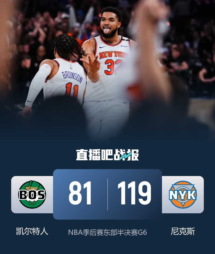 比赛开始,双方上来打得都比较紧,布里奇斯里突外投连续取分助队7-0建立主动权,但杰伦-布朗里突外投连续回应,随后唐斯和布里奇斯连续三分轰出8-0领先6分,次节绿军突然断电且接连失误,尼克斯轰出10-2攻击波一举建立双位数领先,随后哈特连续转换反击,尼克斯多点开花半场领先到27分。下半场,怀特外线终于连续命中追分,但布伦森和哈特还能强势回应,尼克斯拉开30分以上领先,杰伦-布朗6犯离场后尼克斯一度领先到40分以上,末节双方逐步开始练兵,尼克斯始终保持30分以上领先,最终尼克斯119-81大胜凯尔特人,总比分4-2晋级东部决赛,将对阵步行者。