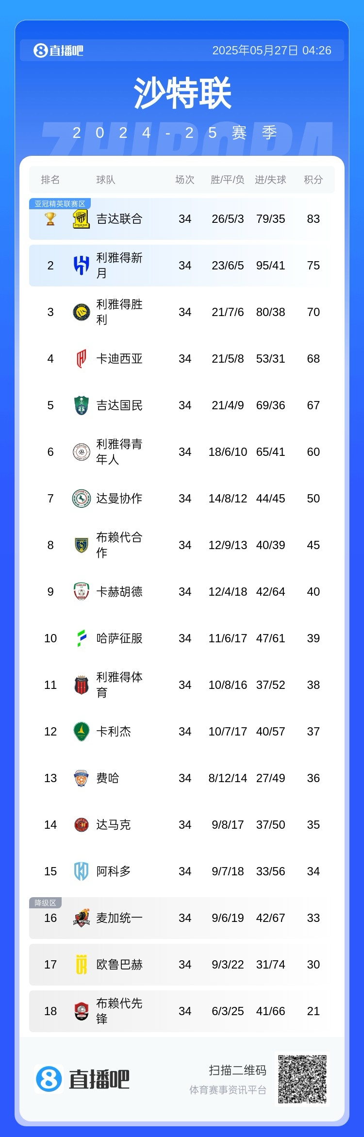 5月27日讯 2024/25赛季沙特联收官,吉达联合提前两轮夺冠,利雅得新月亚军,两队携手获得亚冠精英联赛资格。利雅得胜利则是最终排名联赛第三,无缘亚冠精英联赛。升班马卡迪西亚排名第四,吉达国民尽管排在联赛第五位,但由于他们夺得本赛季亚冠精英联赛冠军,自动获得了下赛季亚冠精英联赛正赛资格。