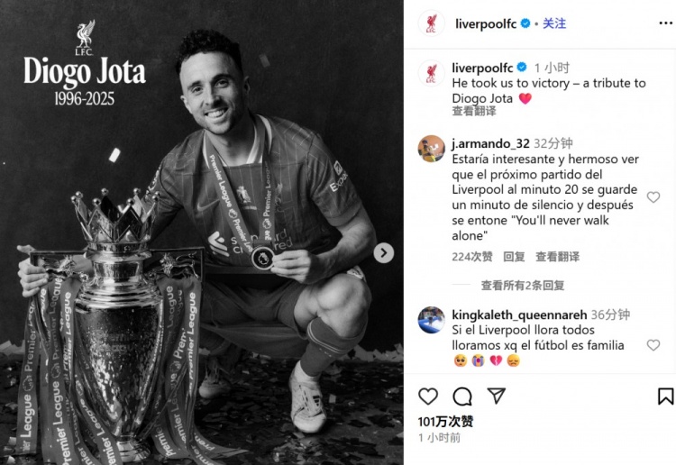 7月4日讯 利物浦前锋若塔因车祸去世,年仅28岁。利物浦官方社媒也撰文悼念: