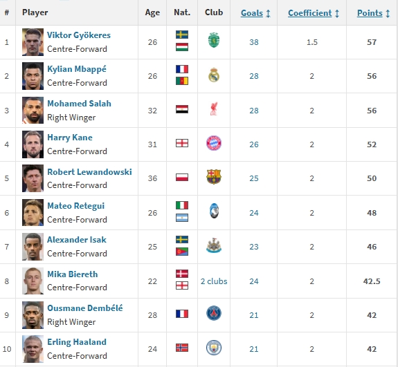 欧洲金靴排名:凯恩定格第4 约克雷斯凌晨争冠 姆总&法老各剩2轮